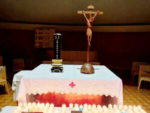 祭壇には「阪神淡路大震災犠牲者各位位牌」と十字架がならびます。
