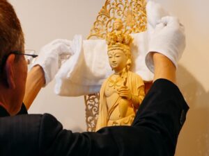 写真は、大願寺の室内型納骨堂に安置されている十一面観音様が、大切に大切に運び込まれた日のご様子です。十一のお顔でこの世をくまなく見渡し、私たちをお救いくださいます。